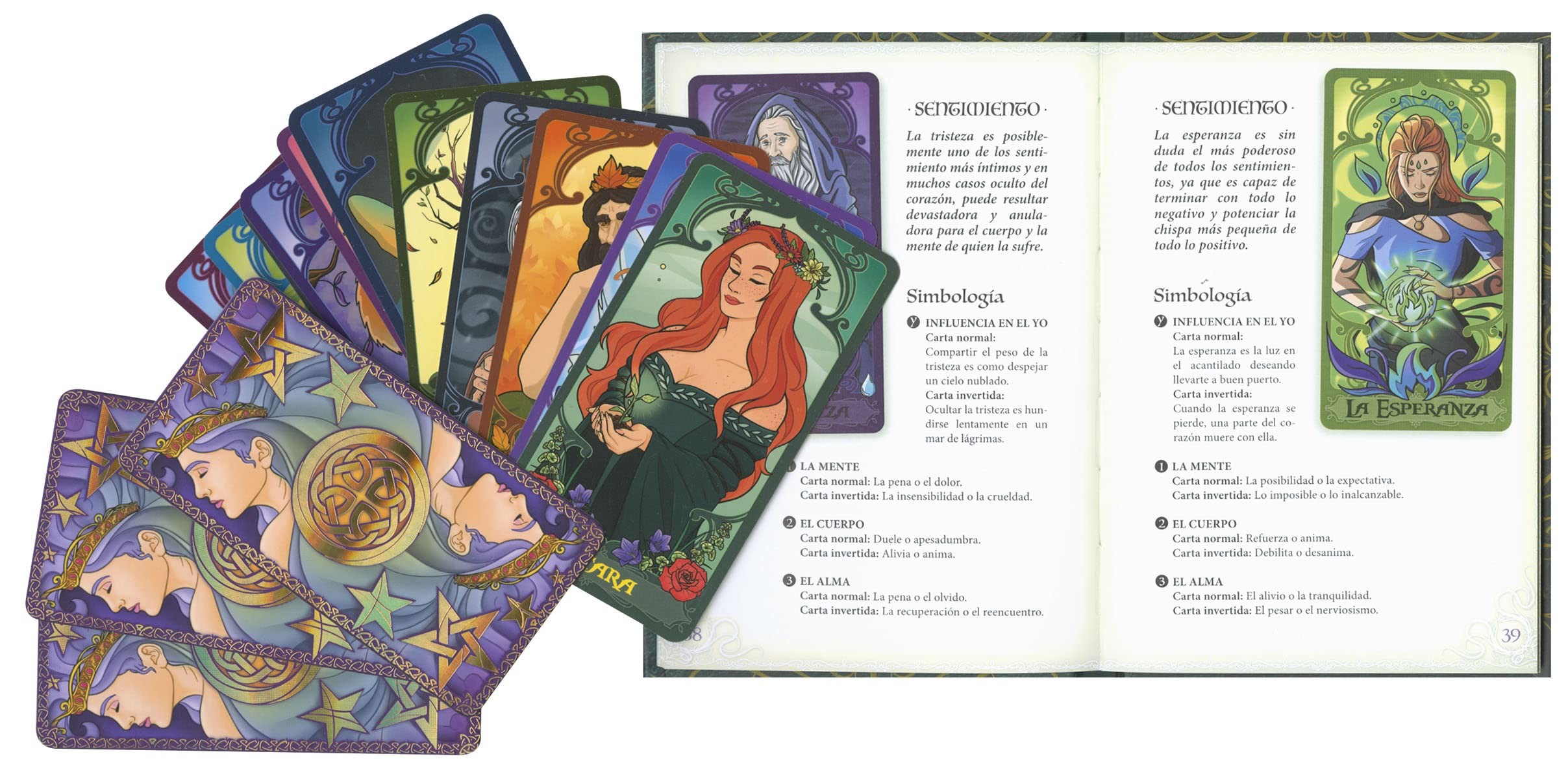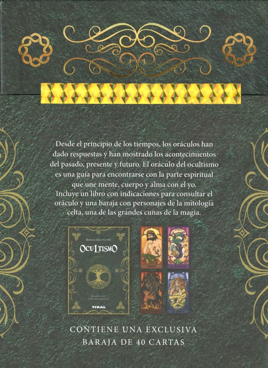 Este kit contiene una baraja de 40 cartas con personajes de la mitología celta y un libro con las instrucciones necesarias para consultar el oráculo y su interpretación.