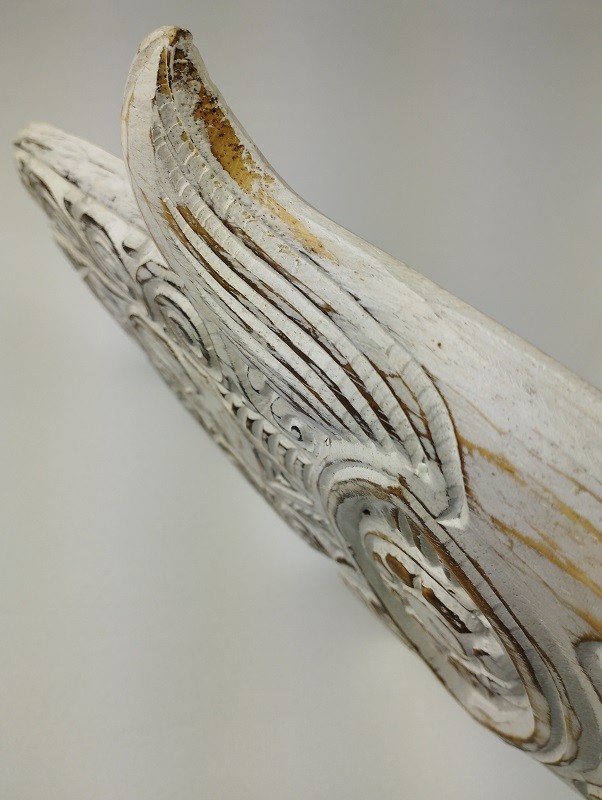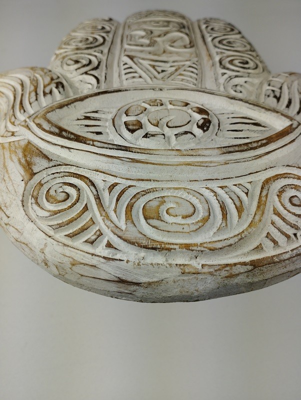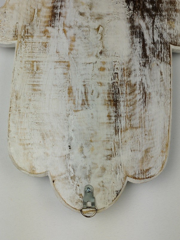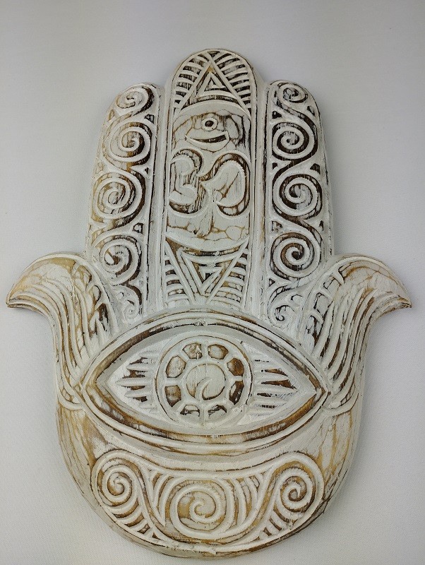 Colgador Mano de Fátima color blanco de madera tallada con símbolo Om.