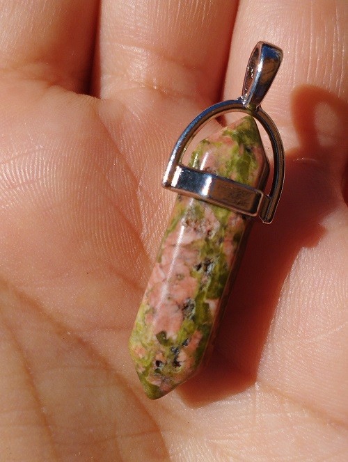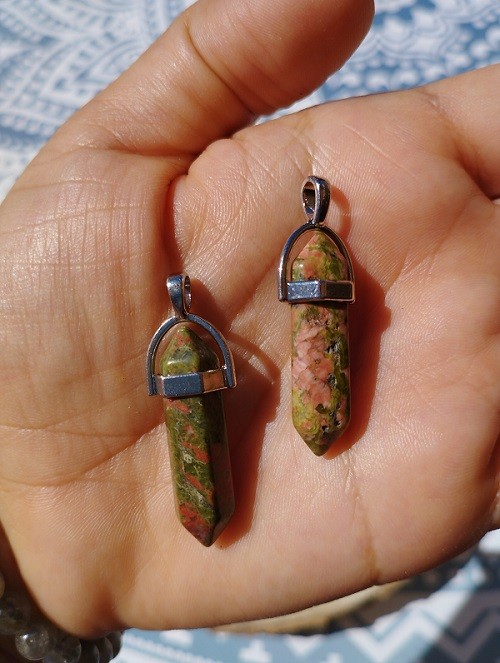 Colgante de punta natural de Unakita y cordón encerado con cierre regulable de bisutería incluido.