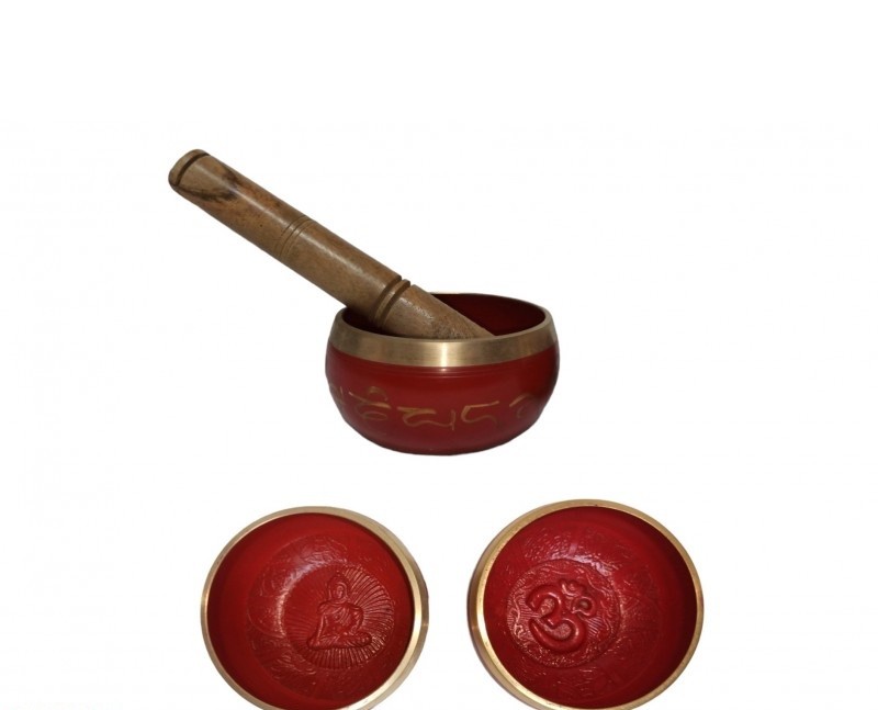 CUENCO TIBETANO Ø9CM ROJO LETRAS Y FONDO RELIEVE (CON MAZA)