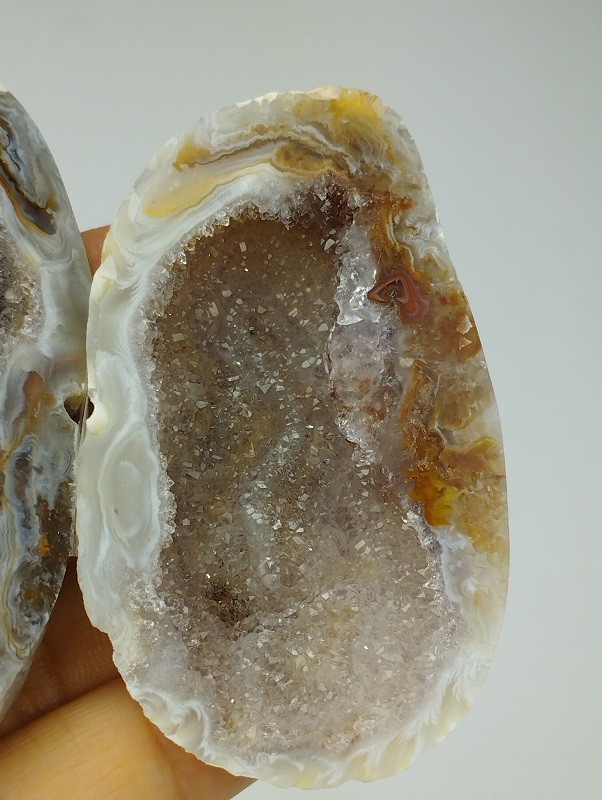 Geodino completo de ágata con microcristales de cuarzo e inclusiones en su interior con la boca externa pulida y matriz natural exterior pulida.