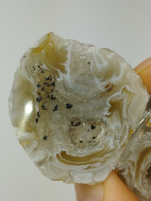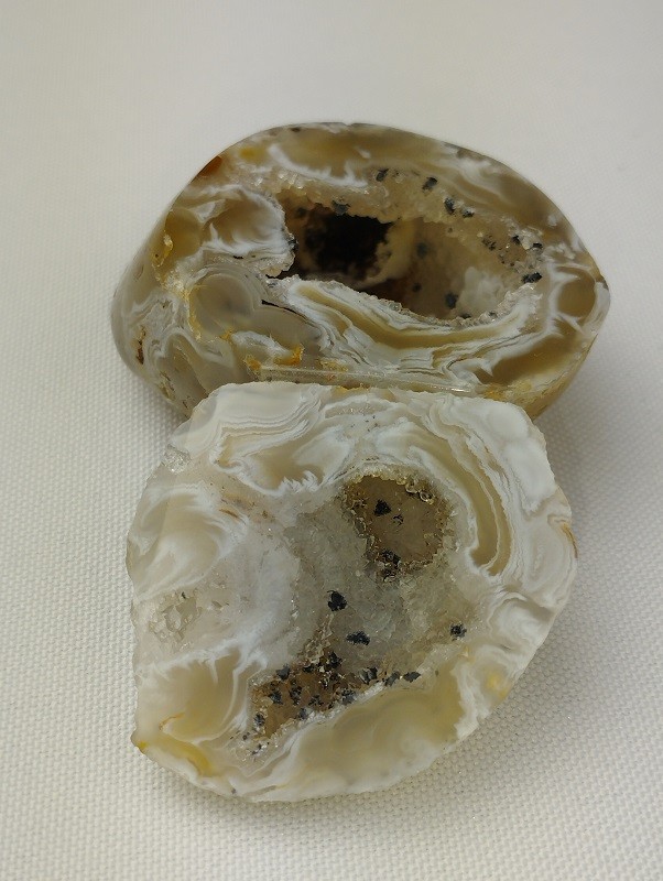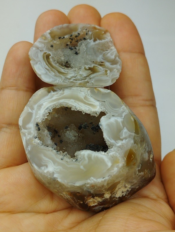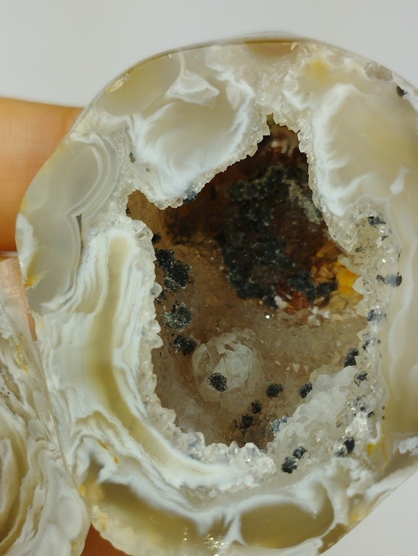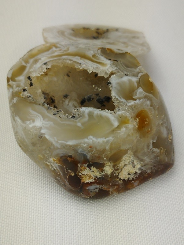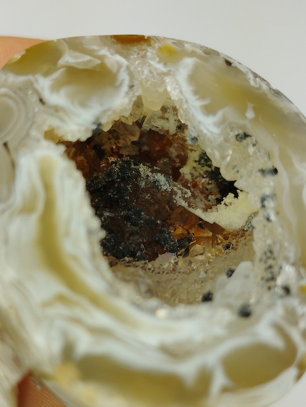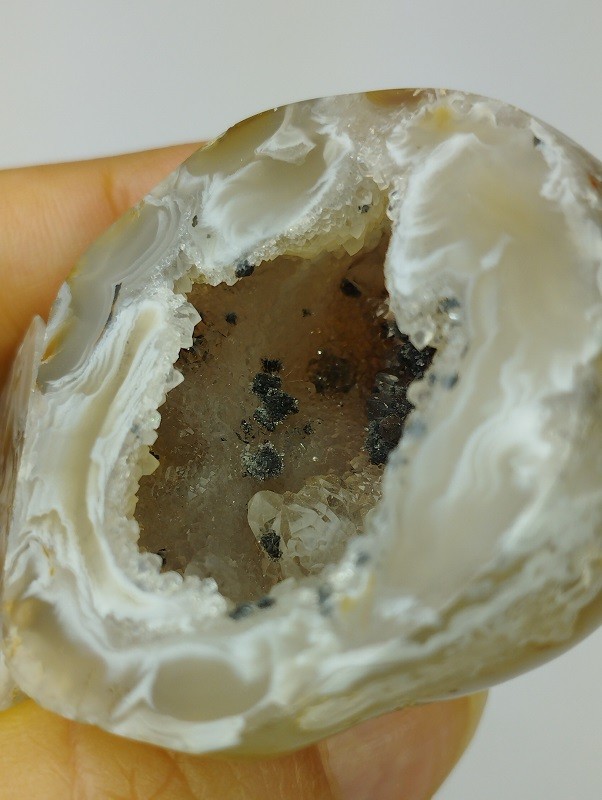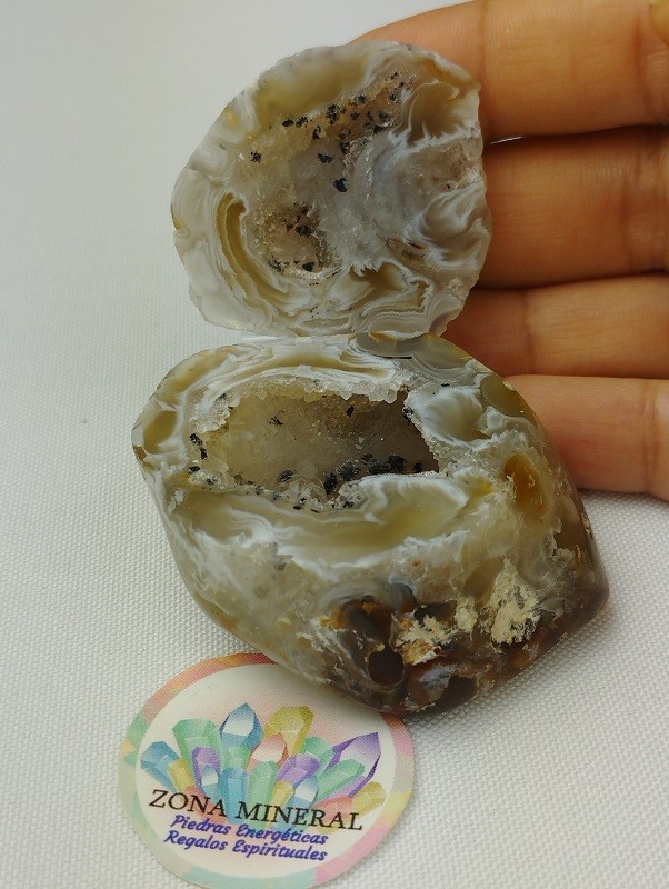 Geodino completo de ágata con microcristales de cuarzo e inclusiones en su interior con la boca externa pulida y matriz natural exterior pulida.