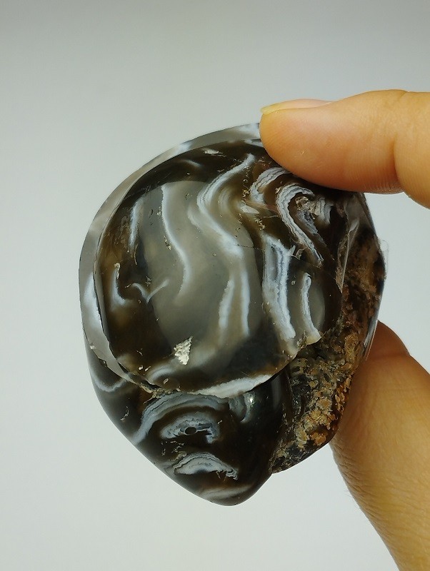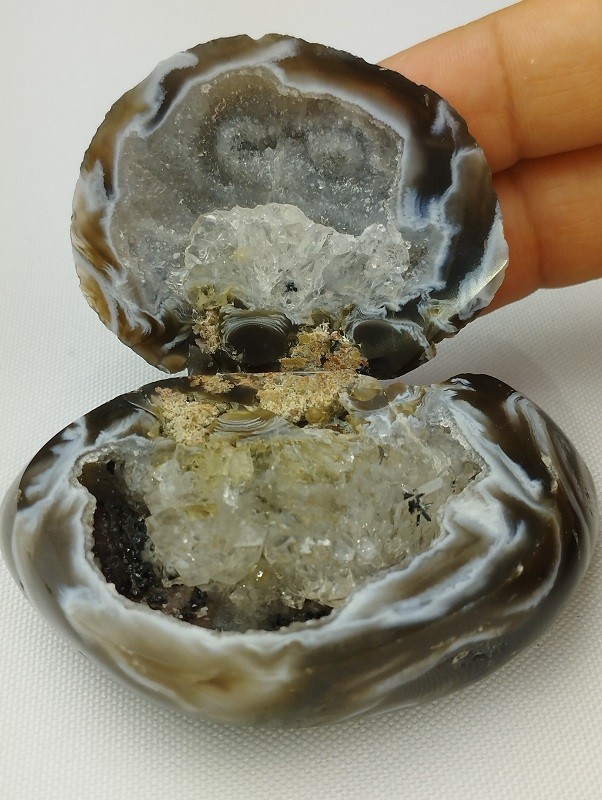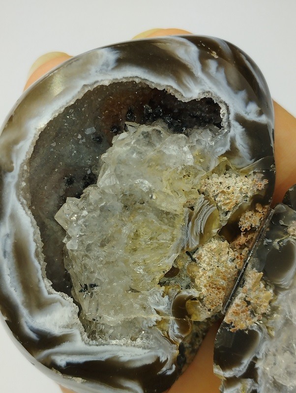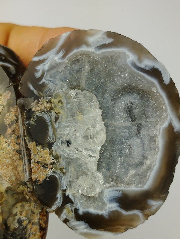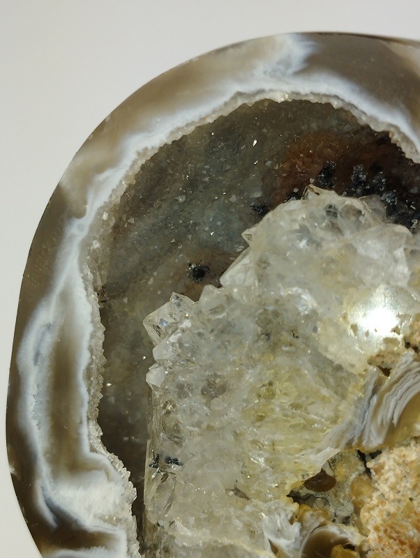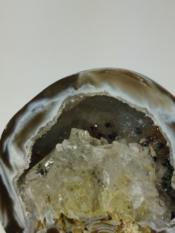 Geodino completo de ágata con microcristales de cuarzo e inclusiones en su interior con la boca externa pulida y matriz natural exterior pulida.