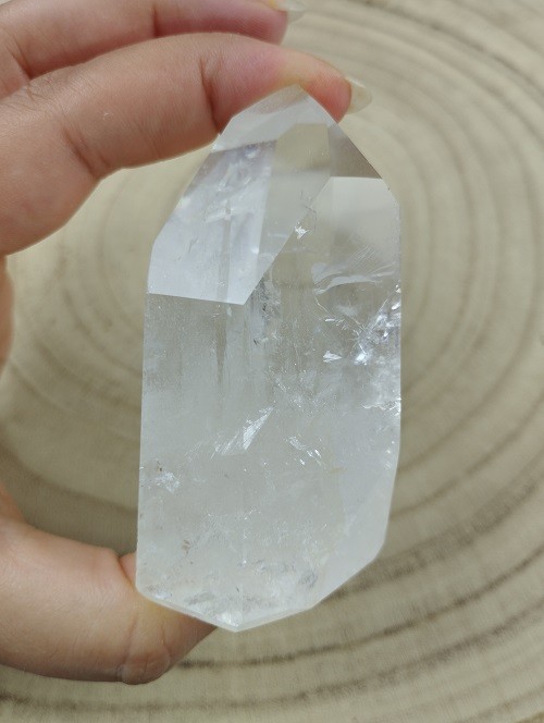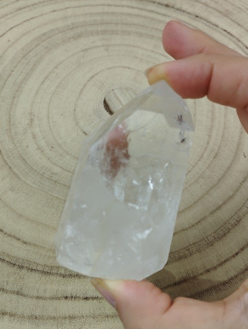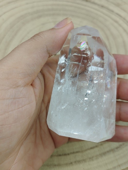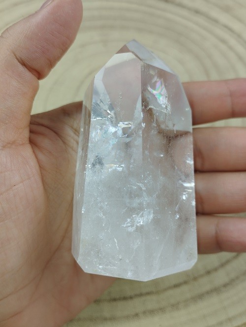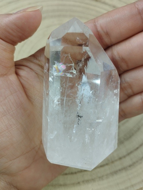 Punta ultra cristalina de Cuarzo Blanco pulida con increíbles arcoíris.