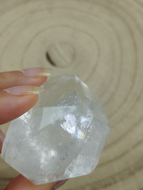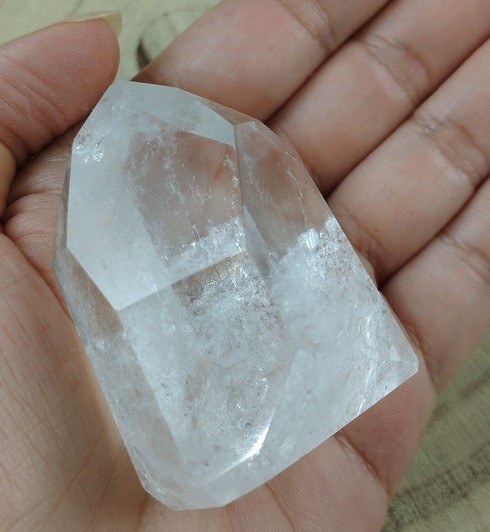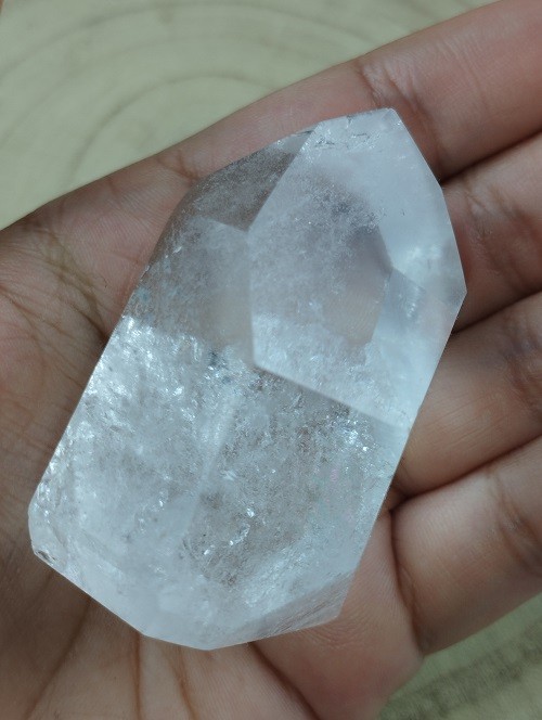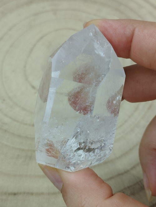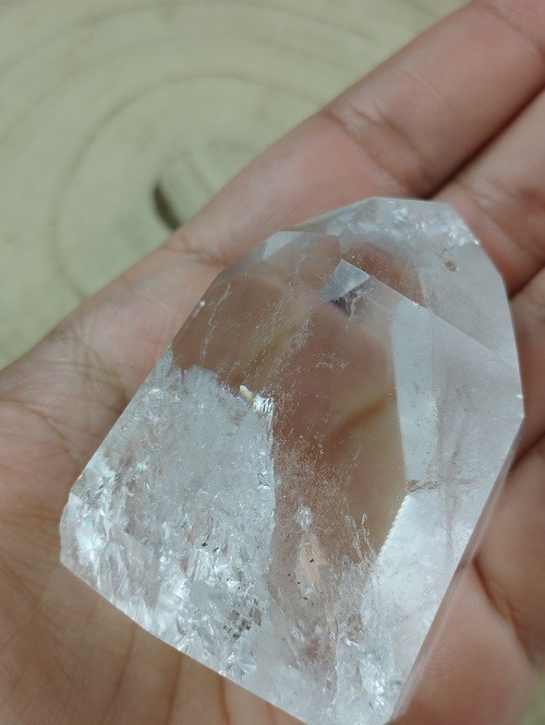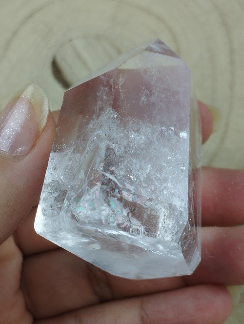Punta ultra cristalina de Cuarzo Blanco pulida con increíbles arcoíris.